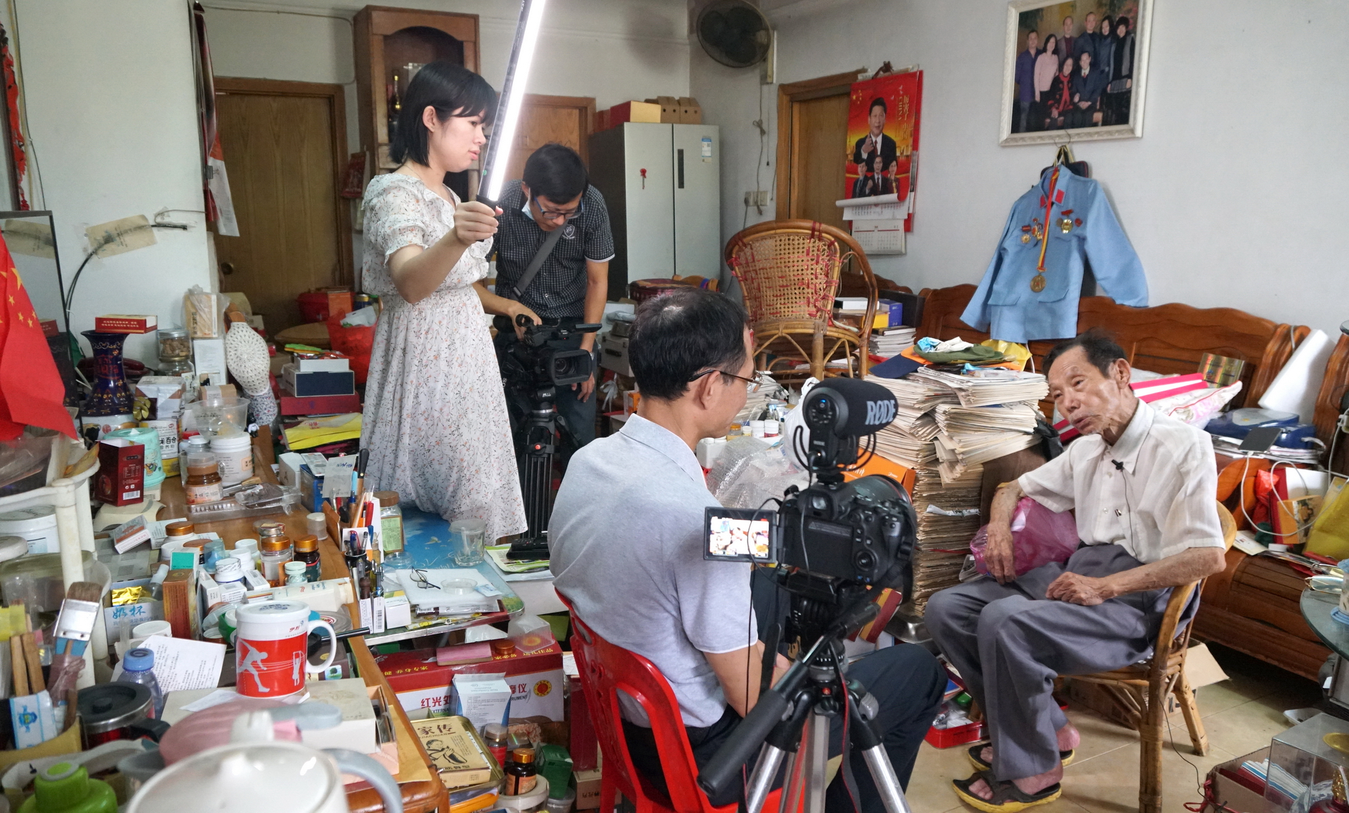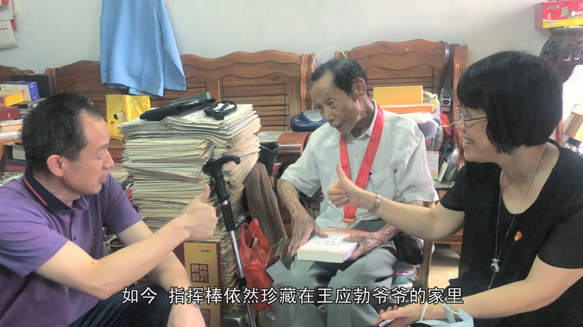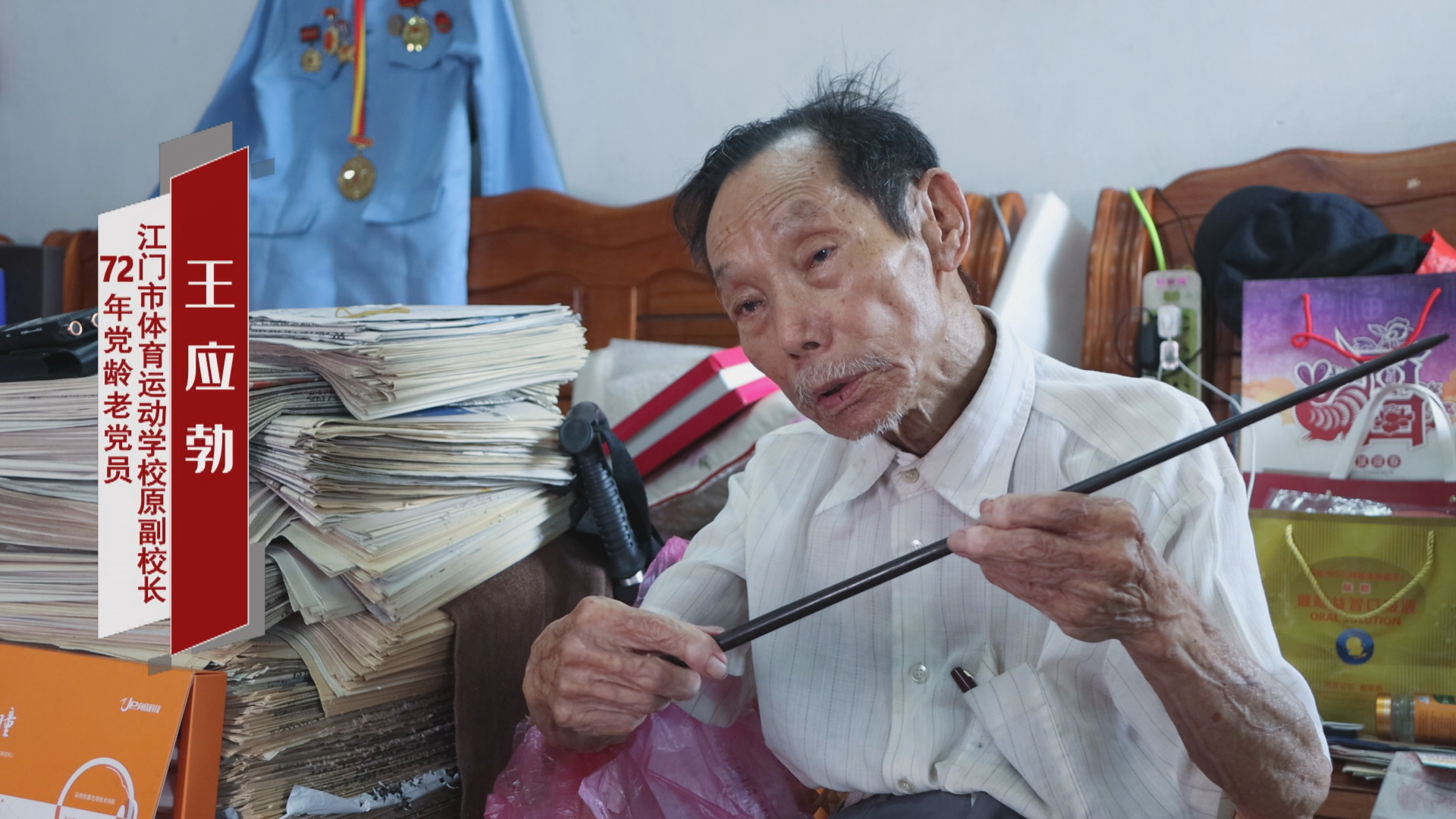 我馆接到市文广旅体局的工作任务后,高度重视,精心组织实施,成立了专门的创作小组。为体现真实、鲜明、生动的人物形象,创作人员多次随同市文广旅体局党组成员、副局长甄瑞珠,局机关党委、专职副书记赵俊伟,副科长麦青霞等领导,前往已有72年党龄的离休老干部、江门市体育运动学校原副校长王应勃家中实地拍摄、采访、收集材料,最后经过选取素材、反复修改打磨,历时近一个月创作出微纪录片《一根指挥棒》。