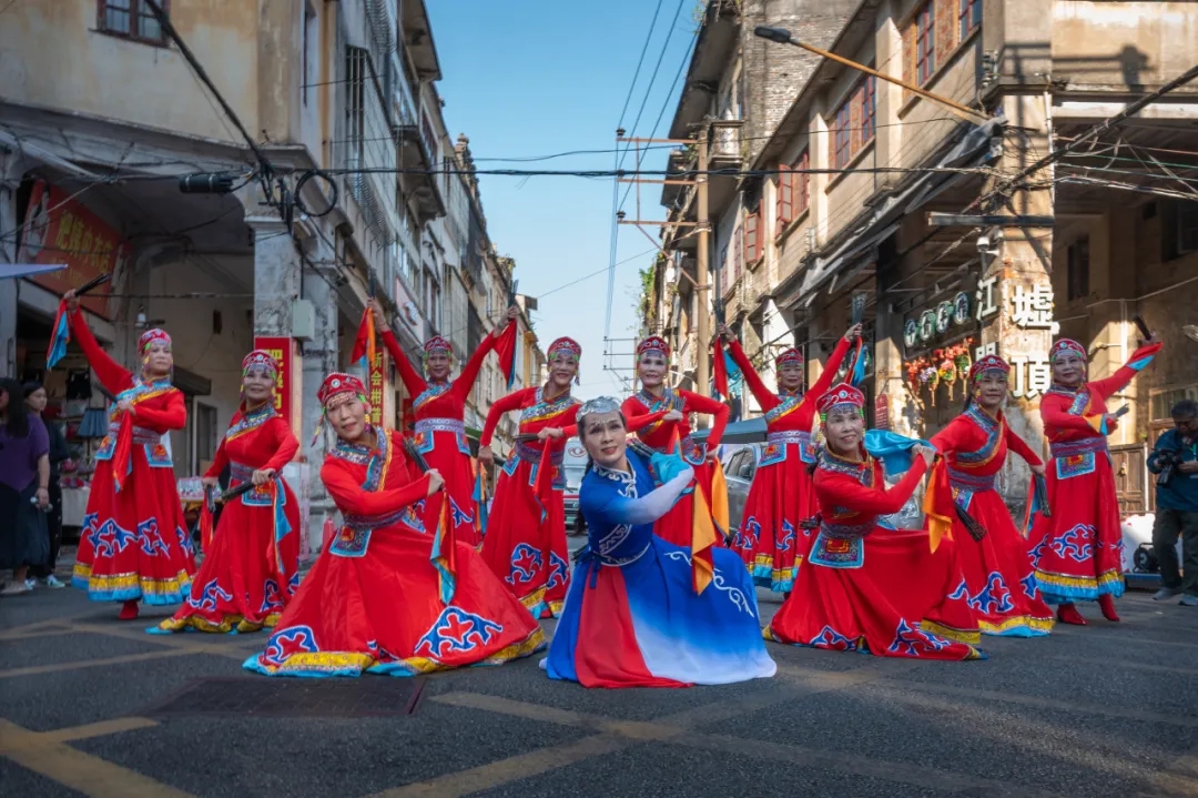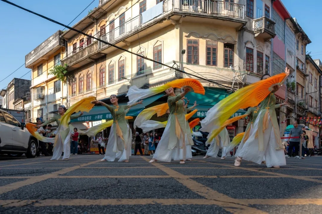 10月25日午后,长堤历史文化街区在秋日暖阳中苏醒。三点三刻,随着阵阵悠扬的旋律响起,江门市文化馆“墟街有戏”舞蹈专场精彩上演,为即将到来的重阳佳节与十五运会营造了喜庆祥和、活力涌动的氛围。