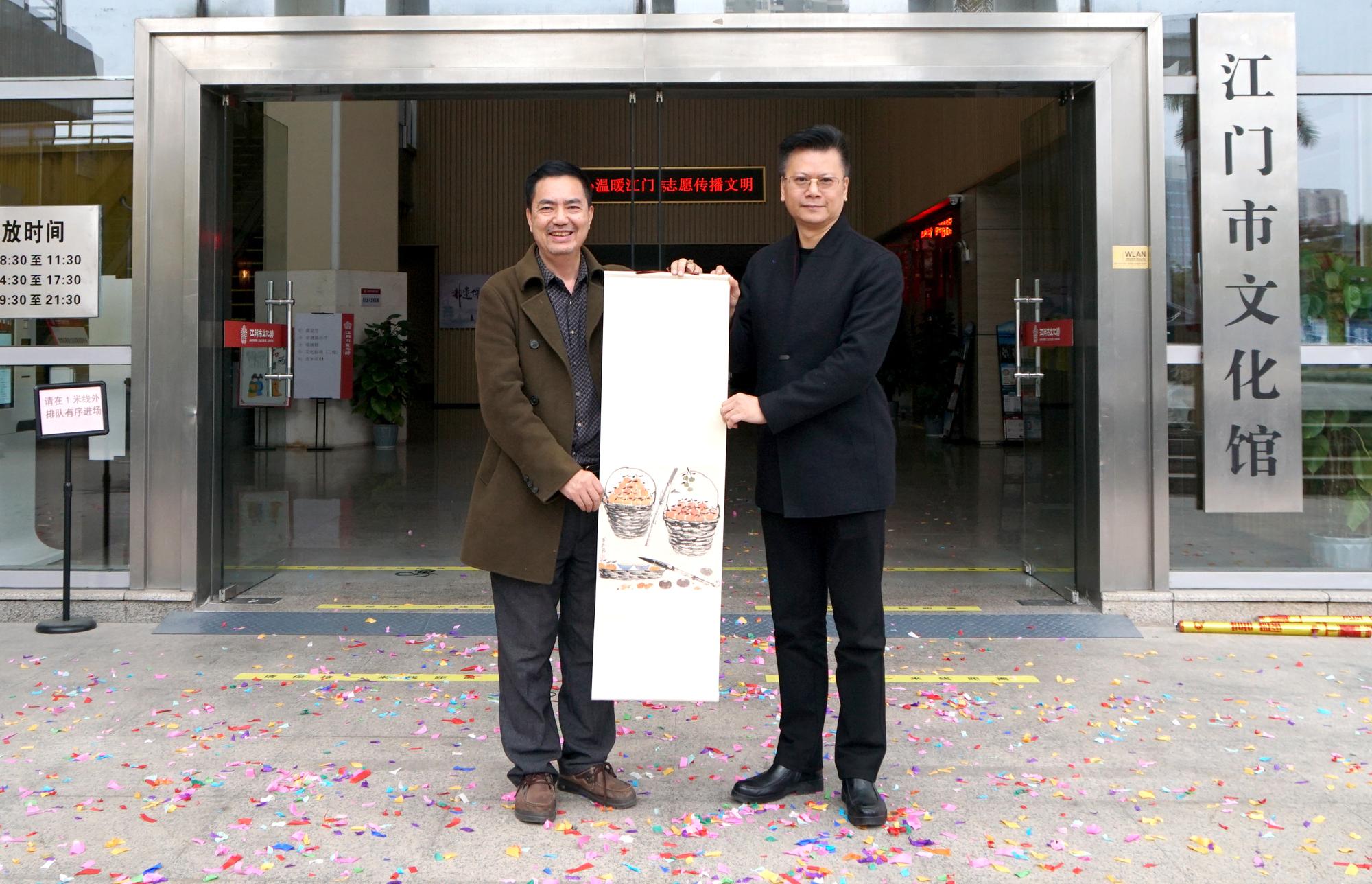 开幕仪式现场还举行了赠画仪式,广东省优秀非遗传承人、工艺美术大师、江门市首批文化名家、冈州画院院长张瑞亨向江门市文化馆赠送了茅龙张大红柑小品画一幅,江门市文化馆馆长、江门市非物质文化遗产保护中心主任蔡朝阳接收礼物。